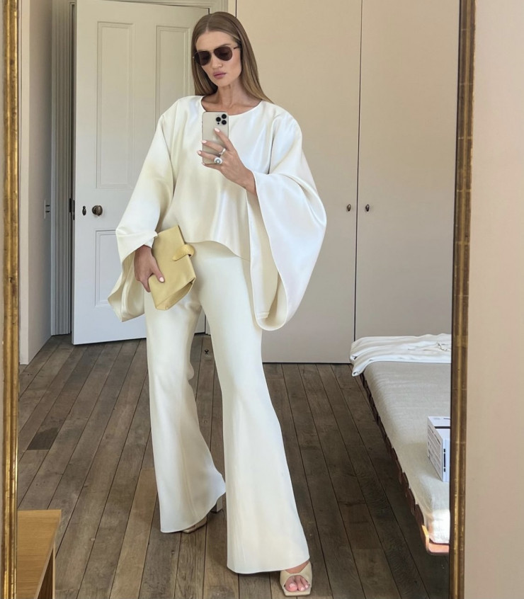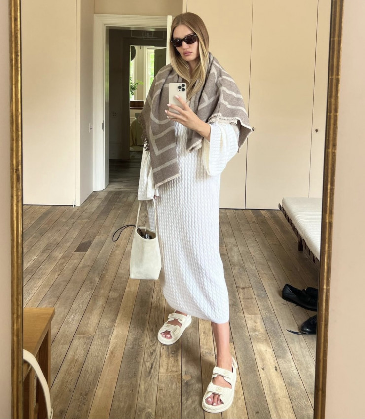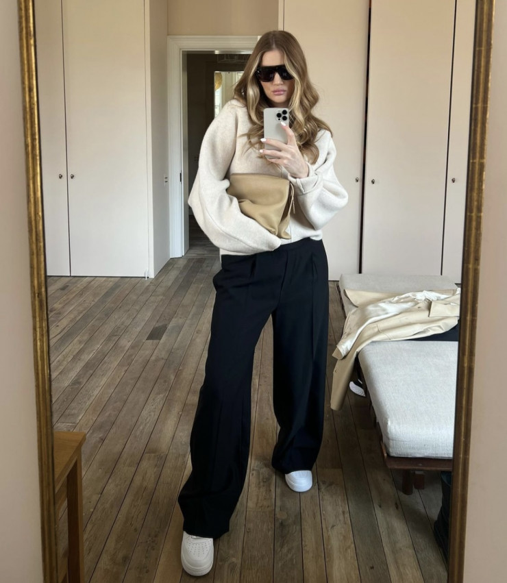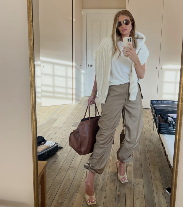 Хит последнего полугодия, брюки карго, модель сочетает с базовым белым топом, накинув поверх шерстяной свитер. Примечательно, что Рози выбрала брюки без главного элемента - накладных карманов, отдав предпочтение завязкам на щиколотке. Ключевую роль в образе играют аксессуары - массивная сумка и очки-авиаторы, вторящие цвету брюк, но в более глубоком оттенке.