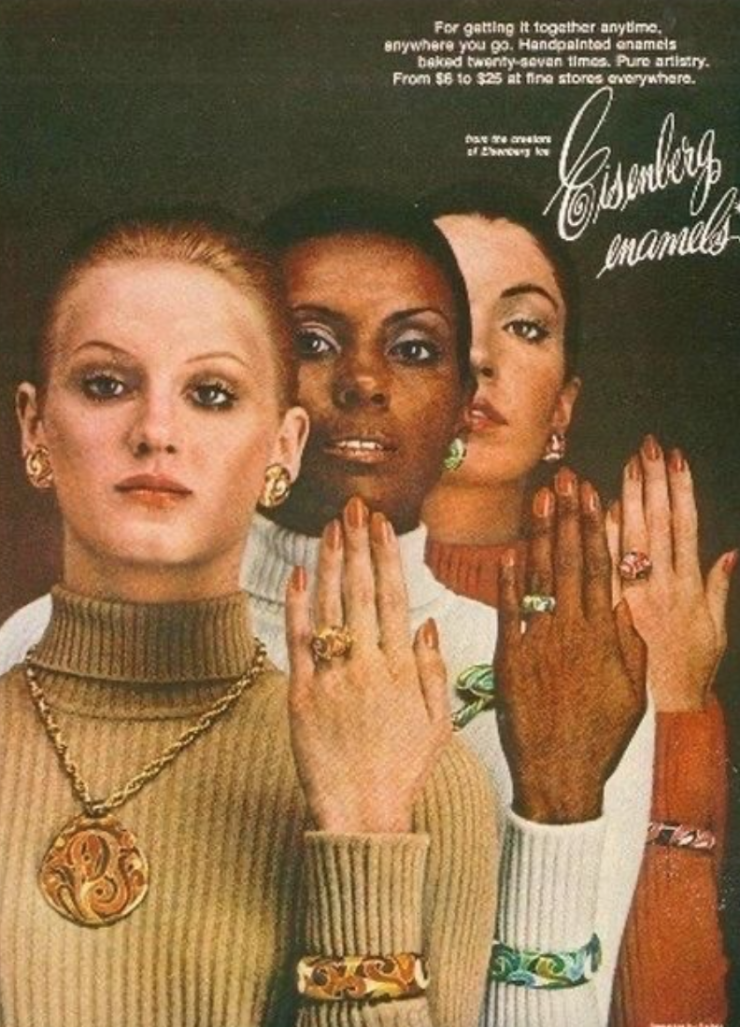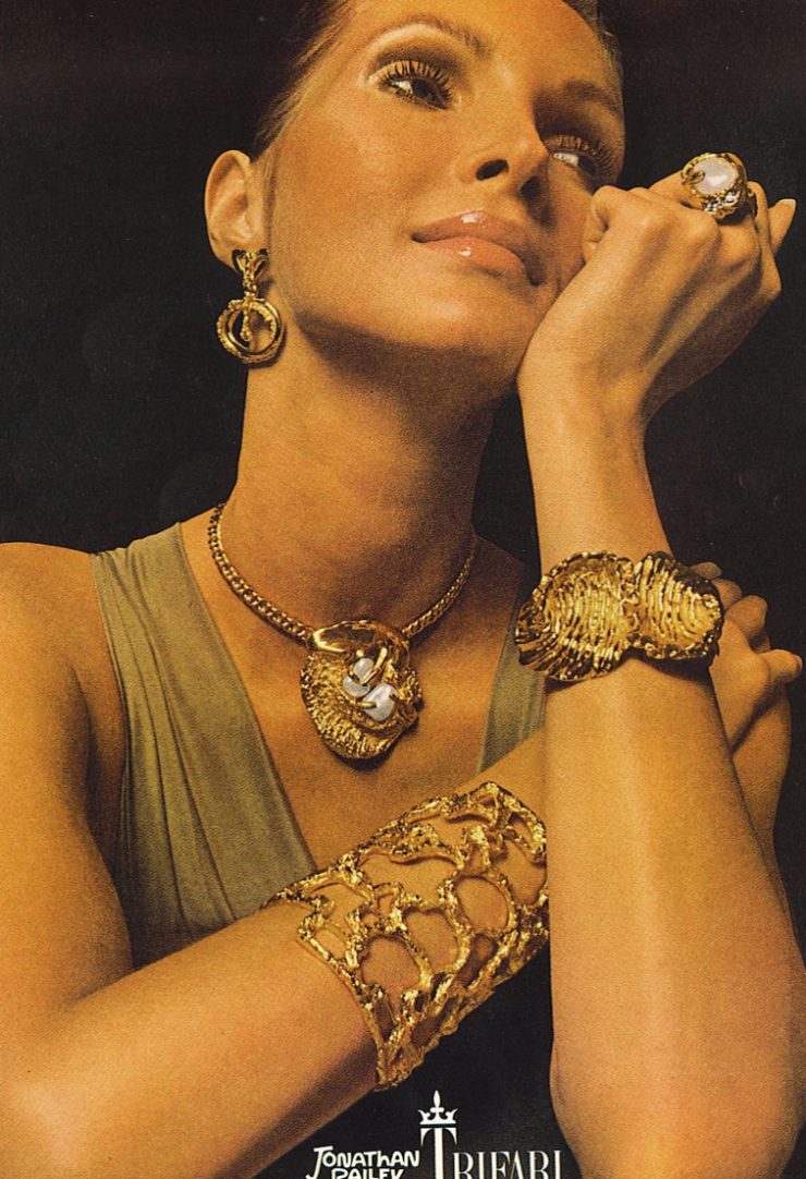 70-е годы – время изменений в мире моды, на смену шику приходят эксперименты. Бриллианты и сапфиры начинают ассоциироваться исключительно с женщинами преклонного возраста, а для молодых дам начинают выпускать сезонные коллекции с использованиям горного хрусталя, искусственного жемчуга и пластика.