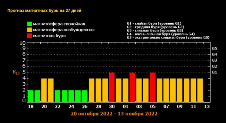 Первые признаки магнитной бури появятся уже завтра, 20 октября. "Возмущение атмосферы" составит 4 балла. Обычно такая буря считается незначительной, она не приносит серьезных сбоев в работе техники или последствий для здоровья.