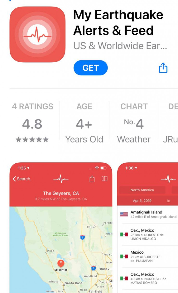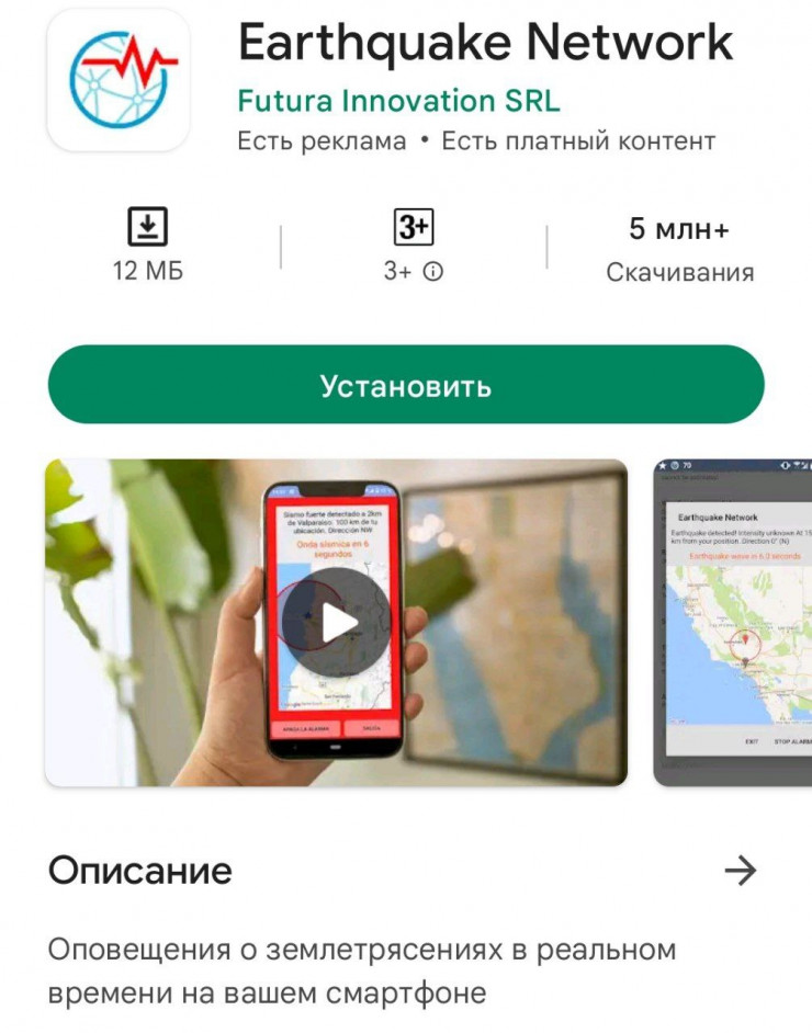 В описании приложения отмечается, что с помощью него можно получить "оповещения о землетрясениях в реальном времени на вашем смартфоне". Также есть реклама и платный контент. У приложения более пяти миллионов скачиваний.