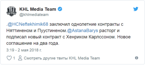 Как информирует официальный твиттер КХЛ, "Барыс" расторг и подписал новый контракт с Карлссоном. Новое соглашение рассчитано на два года.