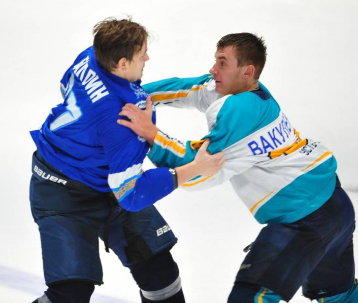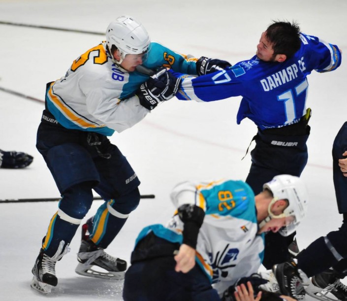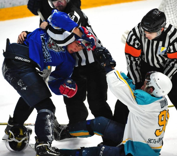 Перчатки сбросили игроки "Снежных Барсов" и "Алтая", устроив настоящее ледовое побоище.