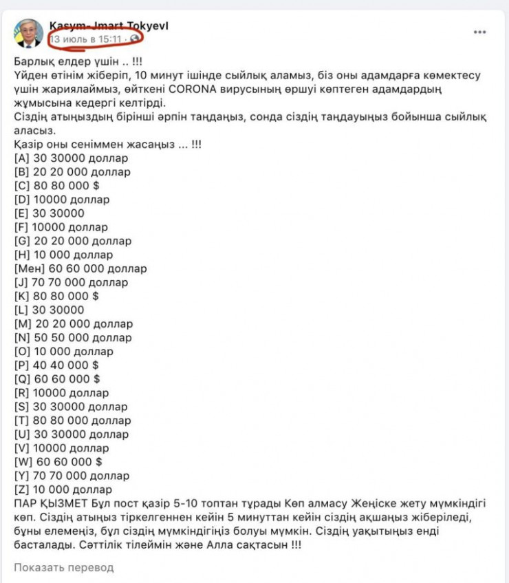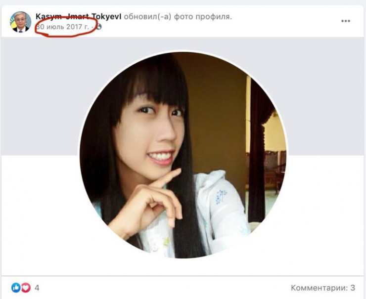Выяснилось, что фейковая страница была создана в 2017 году с фотографией азиатской девушки. 13 июля 2020 года аккаунт переименовался в "Kasym-Jmart TokyevI", а спустя несколько минут был размещен пост о выплате денег.