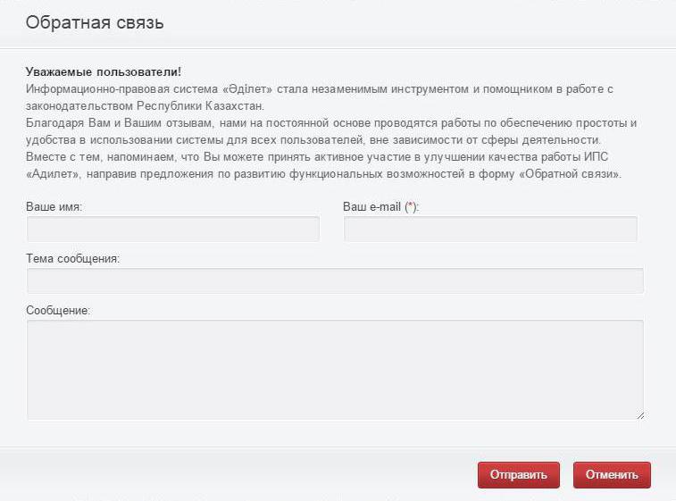 аправить предложения по развитию функциональных возможностей вы можете в форме "Обратной связи" на главной странице сайта ИПС "Әділет".