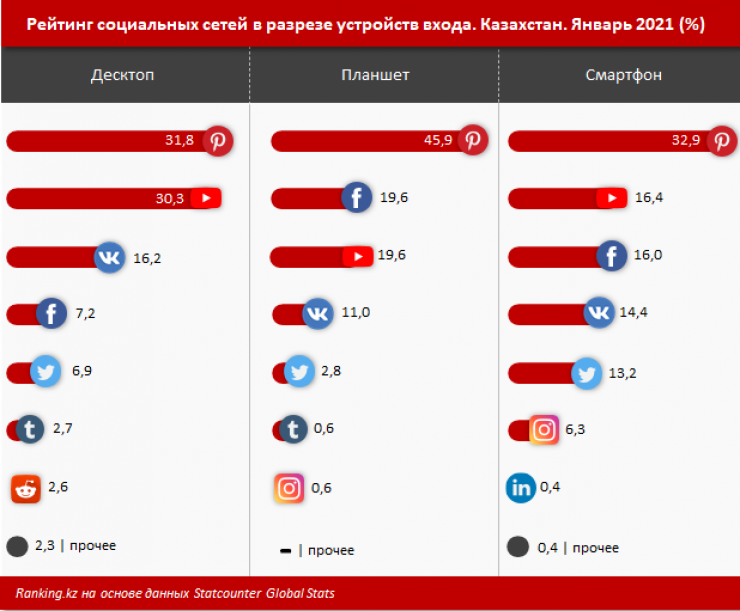 В Казахстане в лидерах оказалась сеть Pinterest - 32,7 процента. В топ-5 популярных соцсетей также вошли YouTube (20,4 процента), "ВКонтакте" (14,9 процента), Facebook (13,5 процента) и Twitter (11,3 процента).