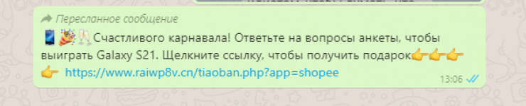 В мессенджере WhatsApp распространяется реклама фишингового сайта. Опасный ресурс предлагает пользователям пройти опрос и получить топовый смартфон. На самом деле это мошенническая схема, позволяющая украсть персональные данные пользователей, передает Tengrinews.kz.