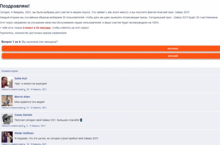 Внизу опроса размещены комментарии пользователей, которые уже якобы выиграли ценные призы. Однако женское имя зачастую сопровождается аватаром с фотографией мужчины или же имена пользователей выдают в них граждан иных стран, в то время как абсолютно все комментарии написаны на русском языке.