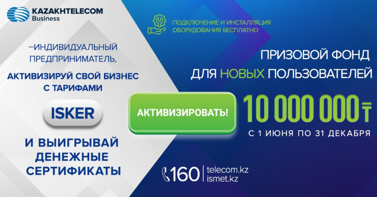 Предпринимателям, подключившимся к тарифу Isker, предоставят бесплатную услугу по его подключению и установке. Список предлагаемых услуг для новых клиентов – это идеальное предложение по соотношению цены и качества, считают в "Казахтелекоме".