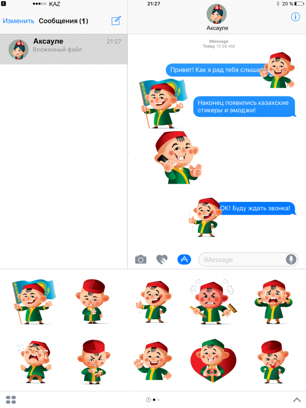 С обновлением операционной системы iOS 10 жителям Казахстана стали доступны национальные стикеры-эмодзи. Бесплатный пакет стикеров появился в разделе AppStore для iMessages (или "Сообщений") под названием "Казахские эмоджи".