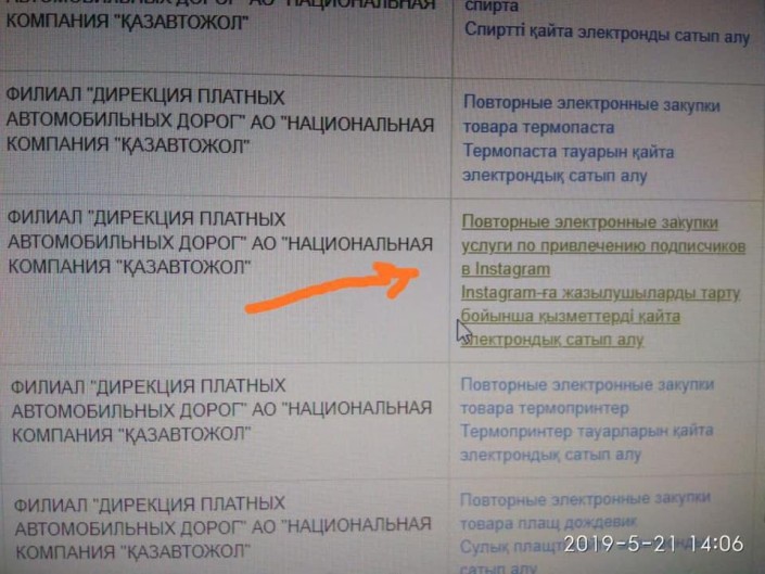В социальных сетях появилась информация о том, что филиал "Дирекция платных автомобильных дорог" национальной компании "КазАвтоЖол" опубликовал лот на сайте государственных закупок по приобретению услуг раскрутки Instagram-аккаунта, передает корреспондент Tengrinews.kz.