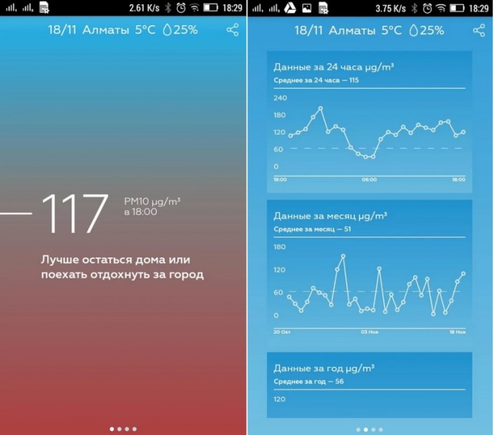 В приложении AUA данные обновляются каждый час. Также можно просмотреть динамику изменения концентрации пыли на протяжении всего дня. При этом рядом с показаниями высвечиваются рекомендации. К примеру, при высоком уровне загрязнения воздуха авторы советуют алматинцам остаться в этот день дома или поехать за город. Скачать приложение можно здесь (Android) и здесь (iOS).