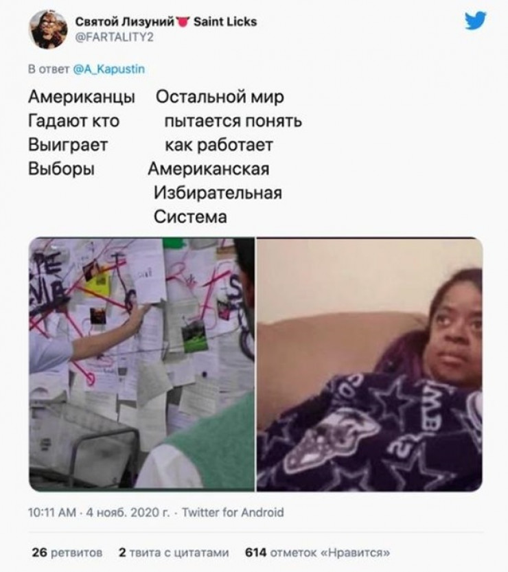 АҚШ-тың сайлау жүйесі қазақстандықтарды ғана таңғалдырмаған сияқты. "Америкалықтар сайлауда кім жеңгенін болжап жатыр. Қалған елдер америкалық сайлау жүйесінің жұмысын түсінбей әлек", - деп әзілдейді желі қолданушыларының бірі.