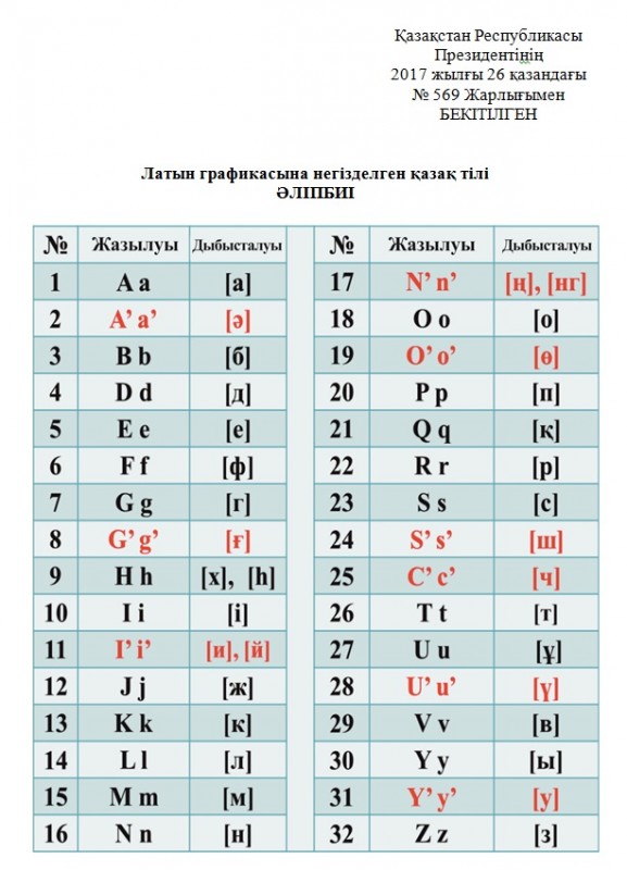 Президент Нурсултан Назарбаев постановил перевести алфавит казахского языка с кириллицы на латинскую графику. Распоряжение об этом появилось на сайте "Акорда" 27 октября. В новом казахском алфавите на латинице 32 буквы.