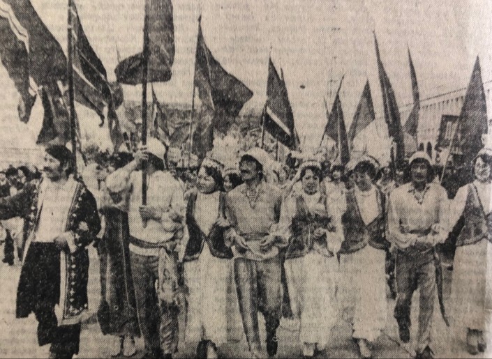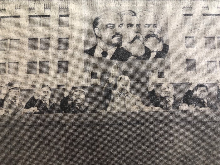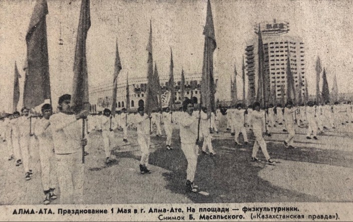 Массовые демонстрации называют "боевым смотром революционных сил". "Сотни коллективов, цехов, бригад и смен рапортуют о своих победах". К примеру, 1 мая на проспекте Ленина (ныне Достык. - Прим. автора) в Алма-Ате был сдан 129-квартирный 12-этажный дом.