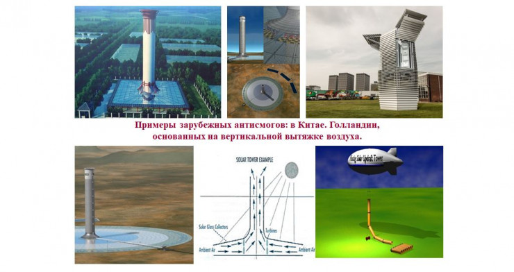 На слайде с мировыми примерами вертикальных вытяжек показаны макеты огромных труб и даже трубы подвешенные на аэростате.