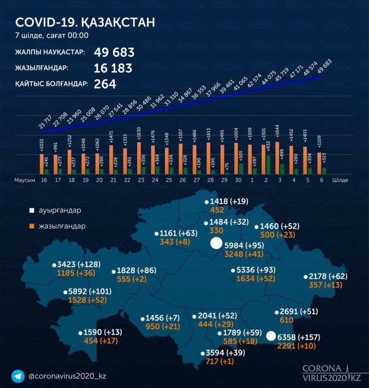 Минувшей ночью стало известно сразу о 76 смертях от коронавируса в Казахстане. Все эти люди умерли в период с 30 июня по 6 июля. Общее число погибших выросло в стране до 264.