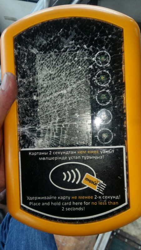 3 ноября 2015 года сообщалось, что в одном из автобусов частного автопарка Алматы разбили терминал регистрации поездок "Онай" стоимостью 232 873 тенге.