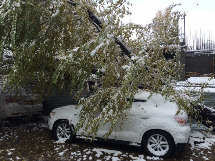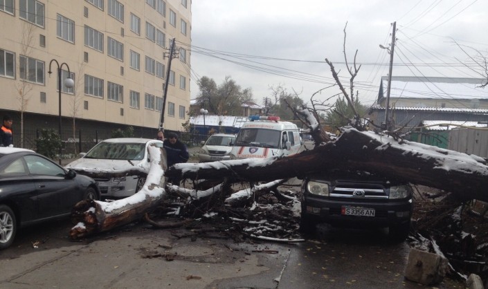 12 авто пострадали от падения деревьев после снегопада в Алматы