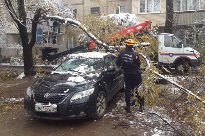 12 легковых автомобилей пострадали от падения деревьев после снегопада в Алматы, передает корреспондент Tengrinews.kz со ссылкой на пресс-службу "Службы спасения города".