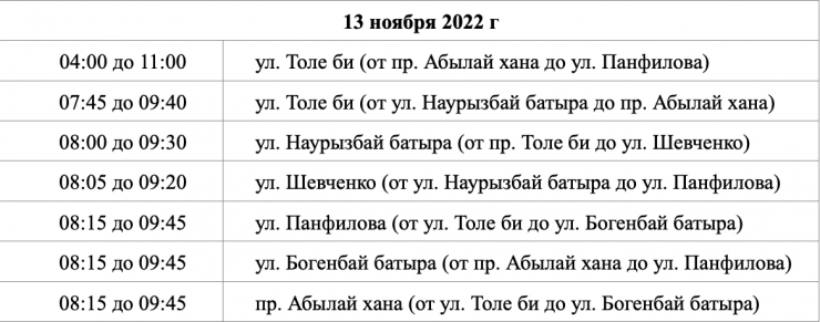 Движение по улице Толе би от проспекта Абылай хана до улицы Панфилова будет перекрыто с 04:00 до 11:00.