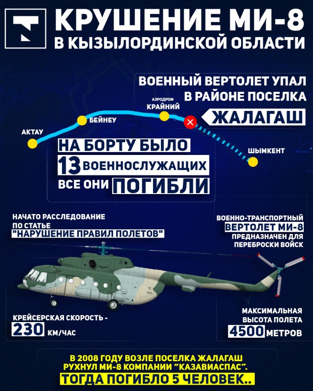 Напомним, вертолет Ми-8 потерпел крушение в Жалагашском районе Кызылординской области. Вертолет при неизвестных обстоятельствах упал и полностью сгорел. На борту было 13 человек.