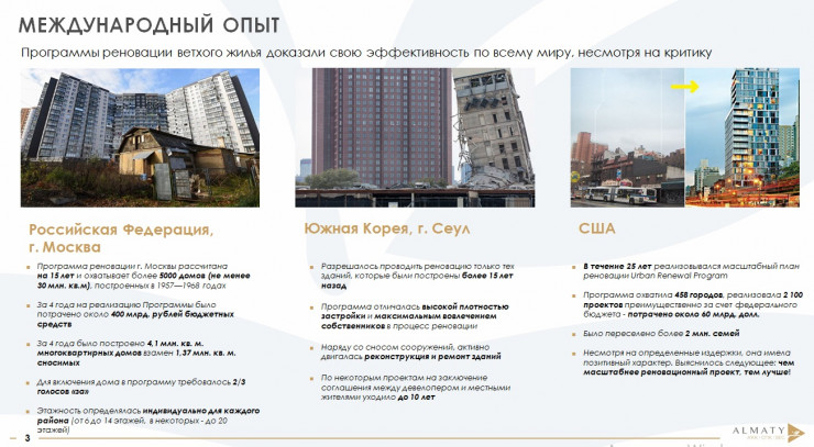 "Программа реновации в Москве рассчитана на 15 лет и охватывает более 5000 домов, построенных в 1957—1968 годах. За 4 года на реализацию было потрачено около 400 миллиардов рублей бюджетных средств, построено 4,1 миллиона квадратных метров многоквартирных домов взамен 1,37 миллиона квадратных метров сносимых. Для включения дома в программу требовалось две трети голосов за. В Южной Корее интересно то, что разрешалось проводить реновацию тех зданий, которые были построены более 15 лет назад. А в США было переселено более 2 миллионов семей", - отметил Аскар Билисбеков.