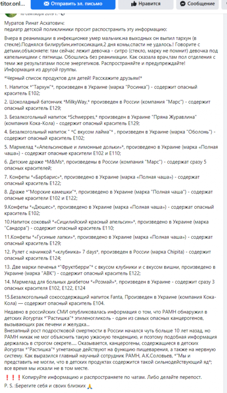 Соңғы уақытта Қазнет қолданушылары педиатр Ринат Мұратовтың атынан хабарлама таратып жатыр. Хабарламаға сәйкес, қазақстандық ауруханалардың бірінде "Тархун" сусынын ішкен бір бала көз жұмған, тағы біреуі реанимацияда жатыр.