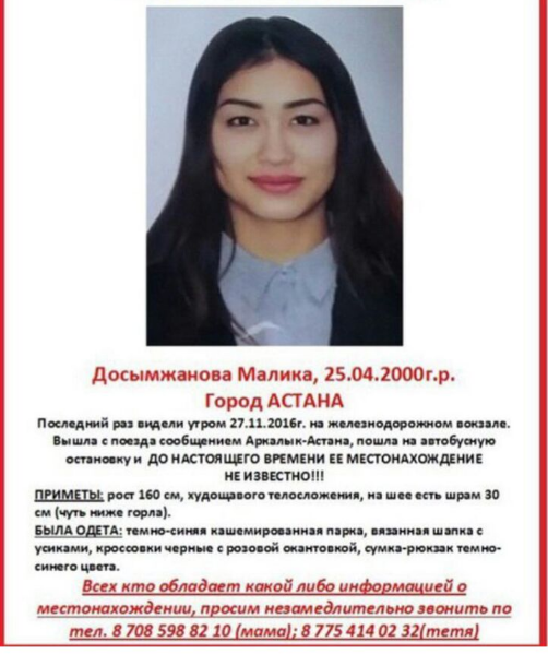В социальных сетях родные пропавшей девушки начали распространять сообщение об ее исчезновении. В объявлении отмечается, что в последний раз Малику видели 27 ноября этого года на железнодорожном вокзале. Она вышла из поезда сообщением Аркалык - Астана и направилась на автобусную остановку, но домой до настоящего времени девушка так и не вернулась.