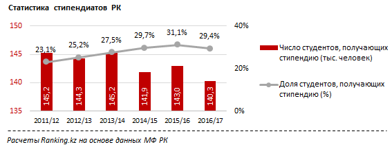 За 2016-2017 учебный год по причине финансовых трудностей выбыло 17 тысяч студентов вузов, из них 11 тысяч - из частных, приводят данные аналитики Ranking.kz. При этом общая численность студентов вузов выросла на 4 процента, составив 477 тысяч человек, а число студентов, получающих стипендии, сократилось почти на три тысячи человек (-2 процента). Это в итоге привело к снижению доли стипендиатов с 31 до 29,4 процента.
