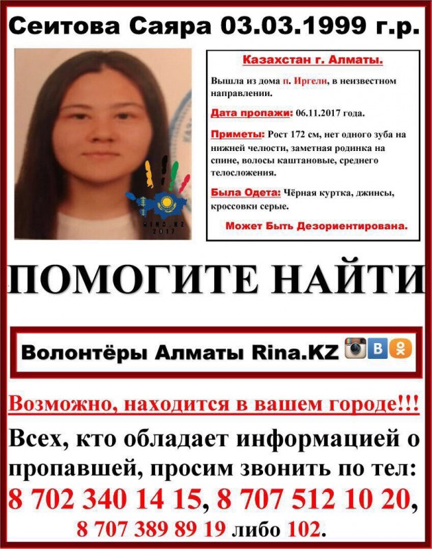 Всех, кто владеет какой-либо информацией о местонахождении Саяры Сеитовой, просят позвонить по телефонам: +7 707 512 10 20, +7 707 389 89 19 или 102.