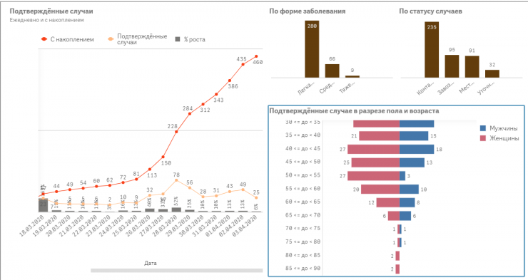 Наццентр предоставил данные по 460 случаям. По форме заболевания известно, что у 9 человек заболевание протекает в тяжелой форме, 66 человек в состоянии средней степени тяжести, у 280 пациентов заболевание протекает в легкой форме.
