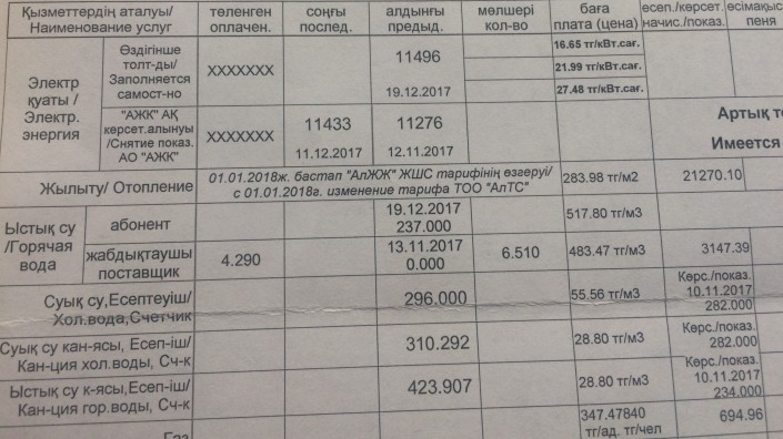 "За коммунальные услуги вышло 24 тысячи тенге, из них 15 тысяч тенге только за отопление. Я посчитала, что рост произошел на 550 процентов за один месяц. Я оплатила. Сходила в КСК, мне сообщили, что общедомовой счетчик не сломан, такой тариф дали тепловые сети. Сказали, что декабрь был холодный. Хотя это не самый холодный месяц, батареи еле теплые были, и мы использовали электрический обогреватель", - сказала женщина.
