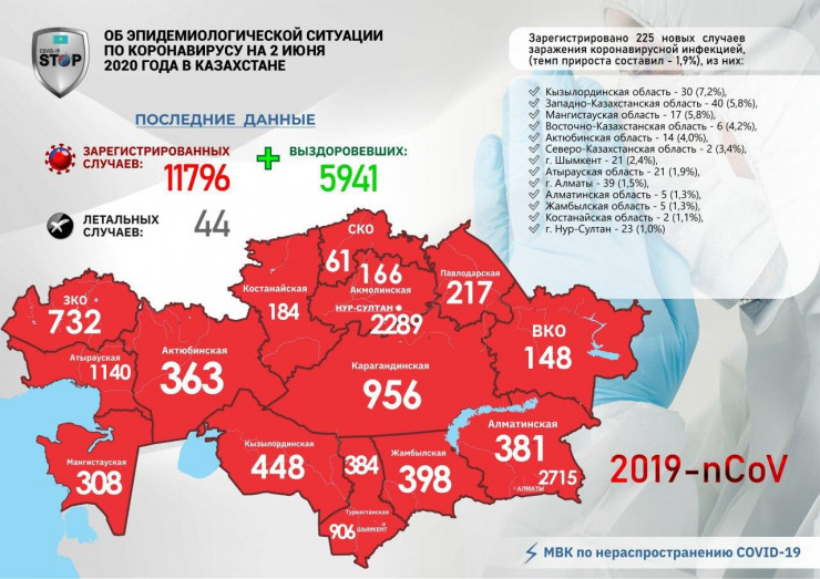В Казахстане за прошедшие сутки выявлено 225 новых случаев коронавирусной инфекции, передает Tengrinews.kz.