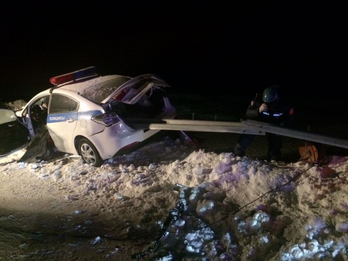 "26 декабря сержант полиции Айтмаганбетов Р.С. при несении служебных обязанностей по обеспечению надзора за безопасностью дорожного движения на автодороге Екатеринбург - Алматы, преследуя автомашину правонарушителя, который превысил установленный скоростной режим в населенном пункте Жибек Жолы Аршалынского района, совершил наезд на отбойную опору", - говорится в сообщении.