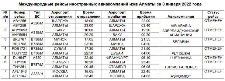 "Из/в города Алматы, Актау, Туркестан, Шымкент, Костанай иностранными авиакомпаниями отменено выполнение 21 рейса в/из городов Москва, Франкфурт, Баку, Дубай, Шарджа, Минск, Стамбул, Ургенч", - также говорится в сообщении МИИР.