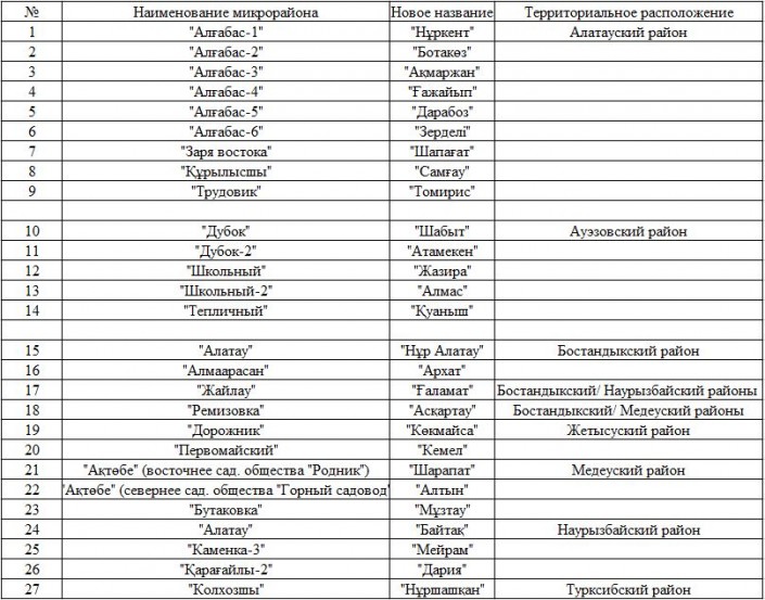 Новые названия также получили микрорайоны Алғабас-1-6, Қарағайлы-2, Каменка-3, Дубок-2.