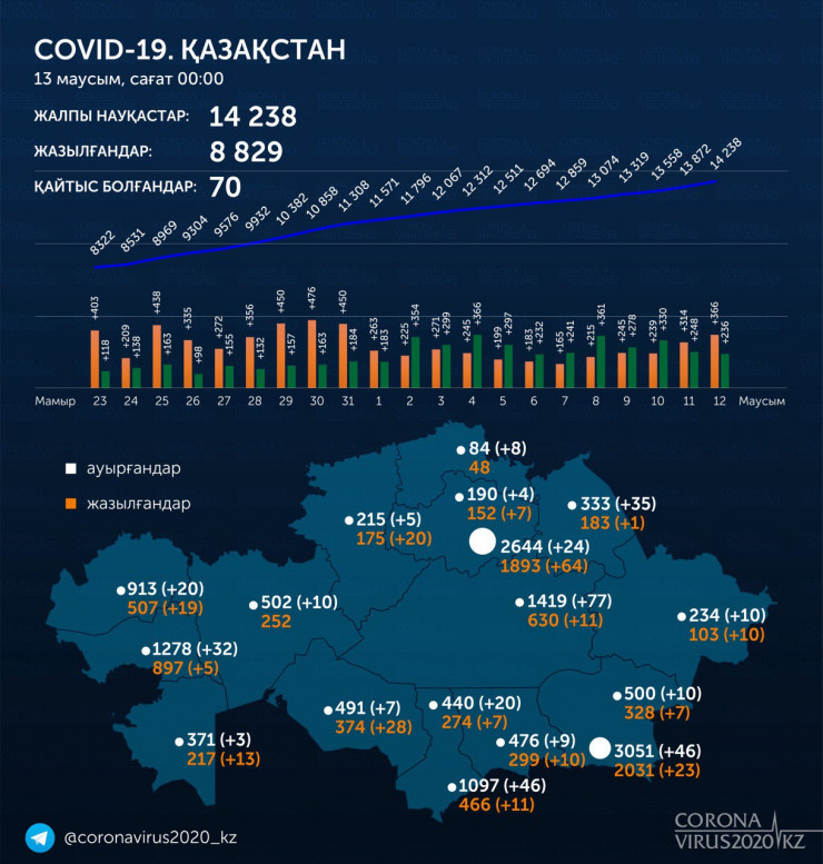 Всего в стране выявлено 14238 заболевших, число выздоровевших пациентов увеличилось до 8829 человек. Летальных случаев - 70.