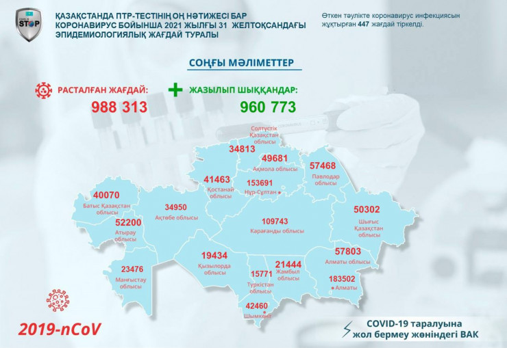 За прошедшие сутки (31 декабря) в Казахстане зарегистрировано 447 новых случаев заболевания коронавирусной инфекцией, передает Tengrinews.kz со ссылкой на данные МВК по нераспространению COVID-19.