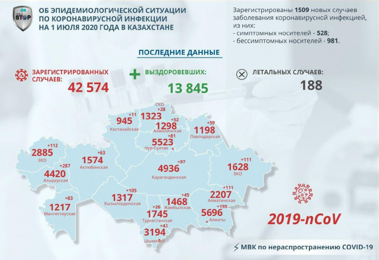 По-прежнему нет информации о новых смертельных случаях в Казахстане. Последнее обновление по умершим было в понедельник, 29 июня. Тогда сообщалось, что число умерших в стране достигло 188 человек.