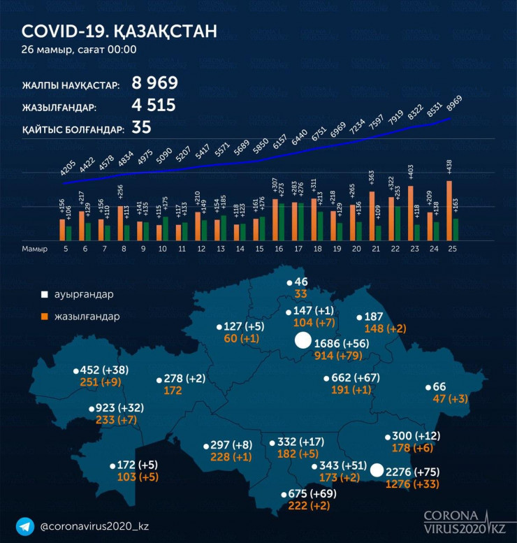 Общее число заболевших с начала эпидемии выросло в Казахстане до 8969: