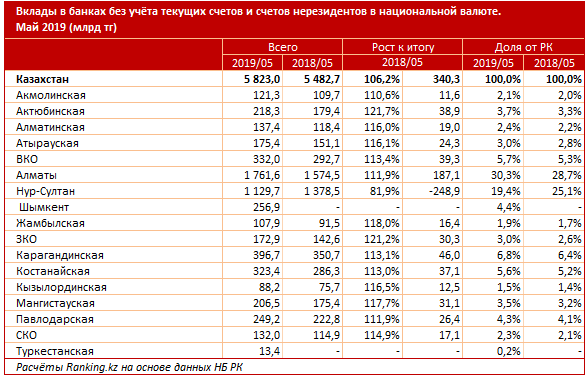Объем вкладов в банках на конец мая 2019 года составил 10,3 триллиона тенге, что на 2,4 процента меньше, чем в прошлом году. Из них 56,7 процента - в национальной валюте: 5,8 триллиона тенге, рост за год - на 6,2 процента.