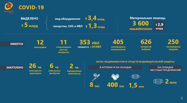 "Все наши силы брошены на борьбу с инфекцией и сохранение стабильной эпидемиологической ситуации. В целом на борьбу с КВИ выделено порядка 5 миллиардов тенге, в том числе на приобретение медицинской техники и оборудования направлено 3,4 миллиарда тенге, на закуп лекарственных средств, средств индивидуальной защиты и ИВЛ-аппаратов – 1,3 миллиарда тенге. С марта текущего года более 3600 медицинских работников получили надбавки и премии в размере 2,9 миллиарда тенге", - сообщил глава региона.