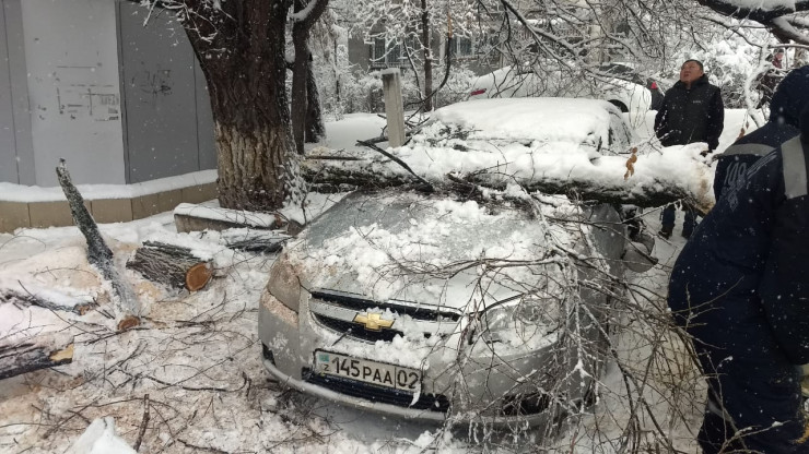Служба спасения 109 сообщает, что всего за сутки в разных районах города Алматы под тяжестью мокрого снега упали 200 аварийных деревьев, 50 из них стали причинами повреждения машин.