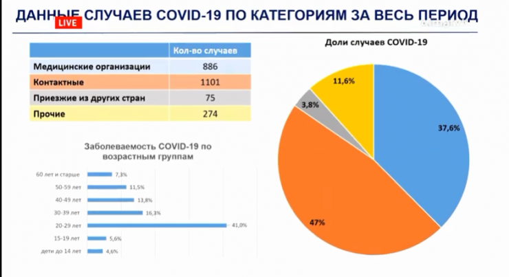 Также, по данным акима города, из зарегистрированных случаев коронавирусной инфекции 886 случаев приходится на медицинские организации, 1101 человек - контактные, 75 - приезжие из других стран и 224 - прочие.