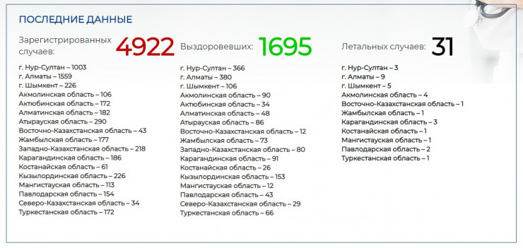Нур-Султан - 366, Алматы - 380, Шымкент - 106, Акмолинская область - 90, Актюбинская область - 34, Алматинская область - 48, Атырауская область - 86, Восточно-Казахстанская область - 12, Жамбылская область - 73, Западно-Казахстанская область - 80, Карагандинская область - 91, Костанайская область - 26, Кызылординская область - 153, Мангистауская область - 12, Павлодарская область - 43, Северо-Казахстанская область - 29, Туркестанская область - 66.