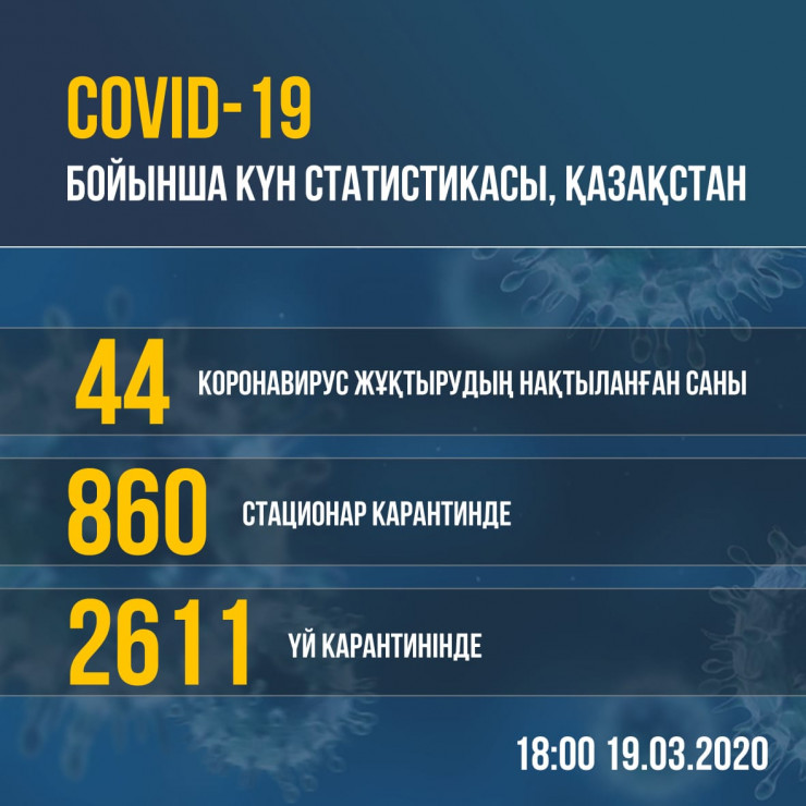 По данным на 18.00, в стране подтверждено 44 случая регистрации коронавируса, из них в Алматы - 19 случаев, в Нур-Султане - 25 случаев. На стационарном карантине находятся 860 человек, на домашнем карантине - 2611 человек.