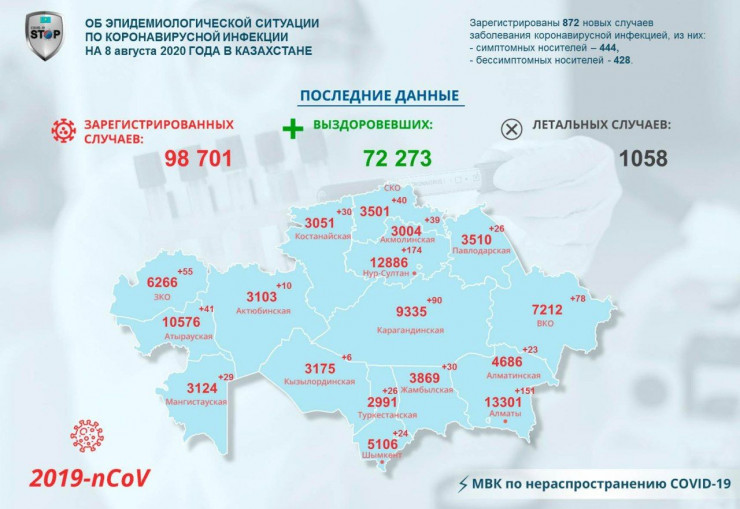 За прошедшие сутки (8 августа) в Казахстане выявлены 872 заболевших коронавирусной инфекцией, передает Tengrinews.kz.