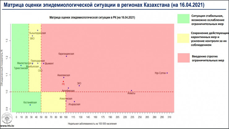 Согласно матрице оценки эпидемиологической ситуации в регионах Казахстана на 16 апреля, в "красной" зоне находятся Нур-Султан, Алматы, Шымкент и Атырауская, Актюбинская, Акмолинская, Алматинская, Западно-Казахстанская, Карагандинская области.