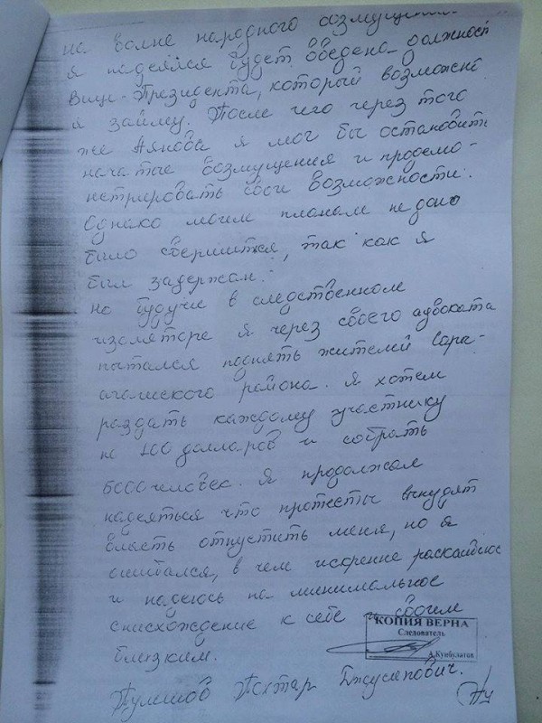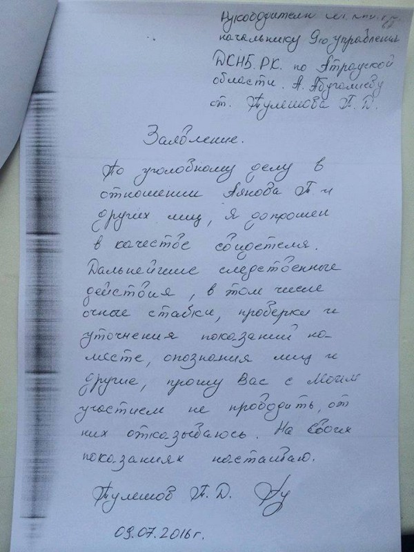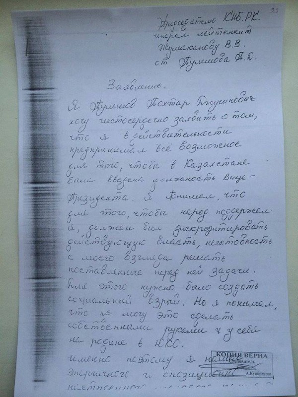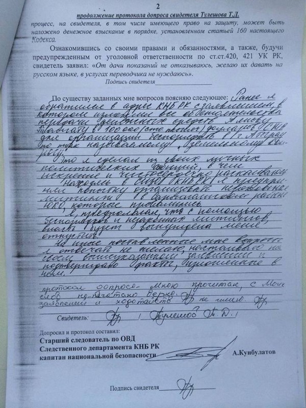 Напомним, 7 сентября в Facebook были опубликованы фотографии копий протокола допроса и "чистосердечного признания" Тохтара Тулешова. В документах, написанных якобы от руки "пивного короля", имеется информация о намерениях свержения власти в Казахстане, об организации земельных митингов и спонсировании гражданского активиста Талгата Аяна, который должен был воплотить в жизнь поставленные задачи.