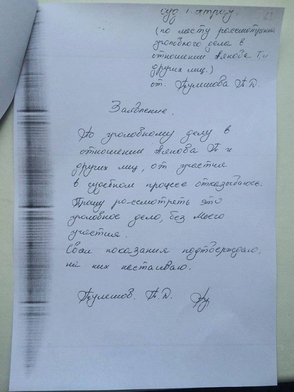 В эксклюзивном интервью изданию Евгений Яворский заявил, что документы, появившиеся в соцсети, действительно написаны Тулешовым. "Дело засекречено, и раскрыть многого не могу. Но могу сказать, что действительно эти протокола написаны им. Это его почерк, это его показания", - сказал юрист.